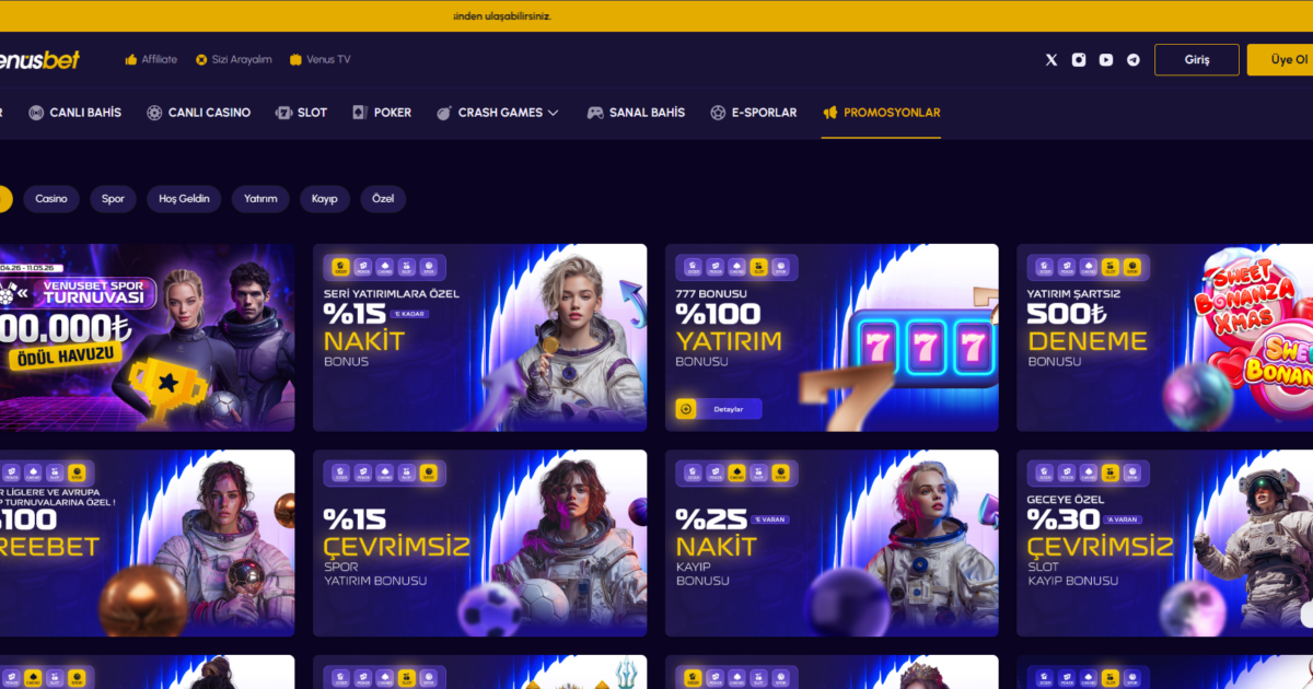 Kampanya koşulları değişkenlik gösterebilir. Güncel detaylar için Venusbet promosyonlar sayfasını veya Telegram kanalını kontrol edin.