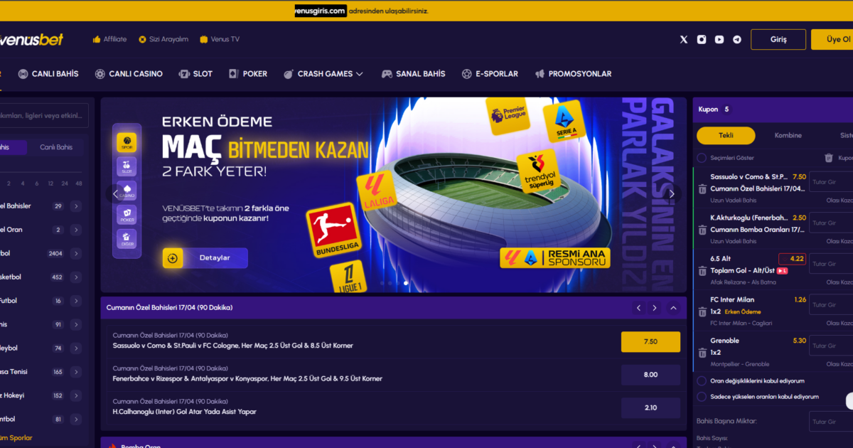 Venusbet, tüm spor dallarında maç öncesi ve canlı bahis seçenekleri sunan, La Liga ve Serie A resmi sponsoru bir platformdur. Bu rehberde spor bahis türleri, canlı bahis özellikleri, e-spor bahisleri ve strateji ipuçlarını bulacaksınız.